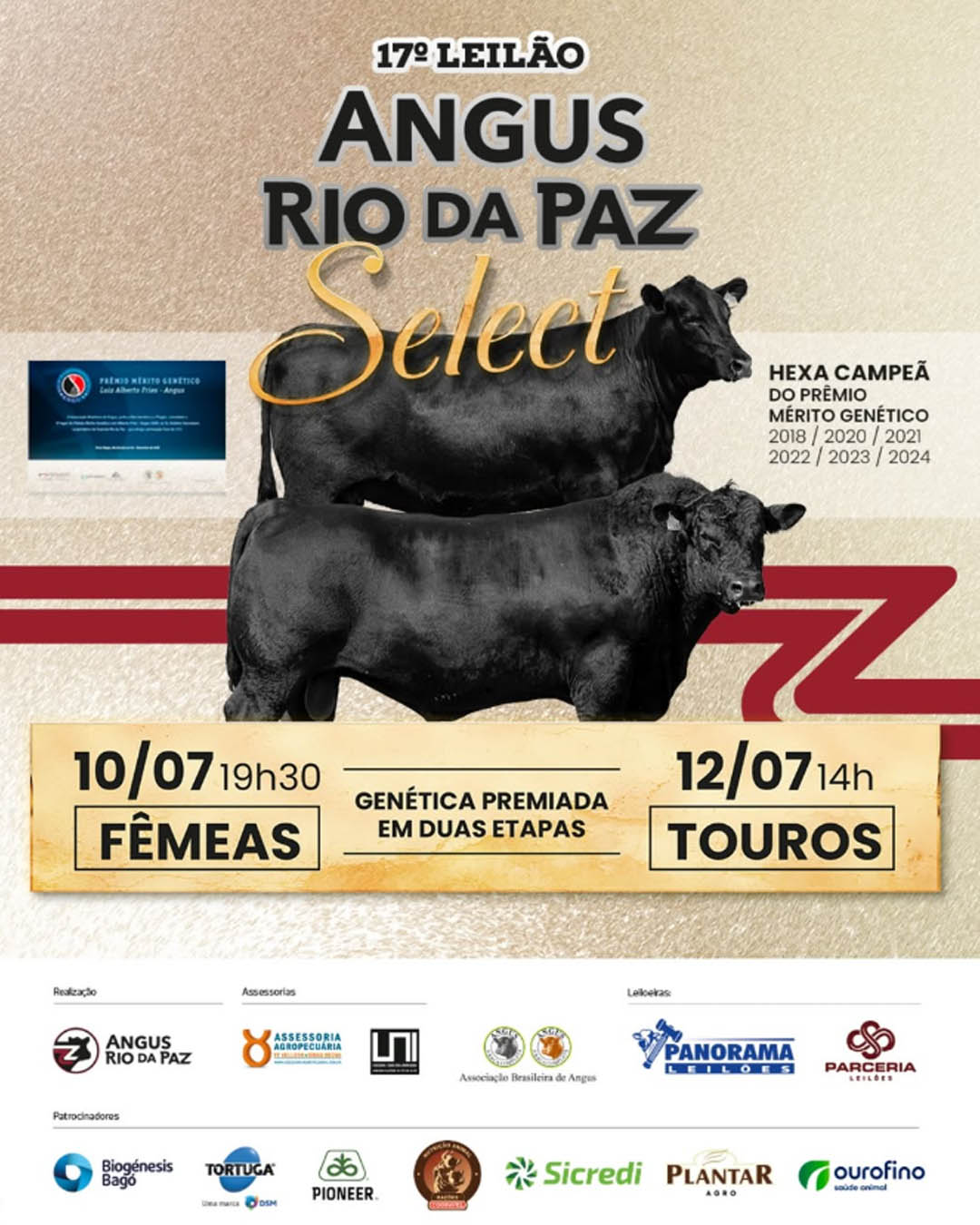 Vem aí a 17ª edição do Leilão Angus Rio da Paz Select! 🏆 Dois dias dedicados à vender a excelência da genética Angus, os exemplares com as melhores avaliacões do nosso plantel reunidos na oferta do leilão